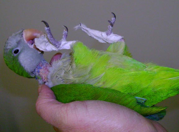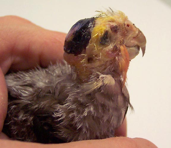 This little guy was found by one of our clients in a pet store with his leg caught in a toy, unable to get to food or water. He had obviously been trapped for several days as his leg had turned black and was dead and cold. The careless pet store employees let her take the bird, and another client of ours drove him over to us. There was nothing we could do to save his leg, but we got him safely set up in a brooder with food and water and a bandage to support his damaged leg. We later amputated it, and he is doing fine with one leg.