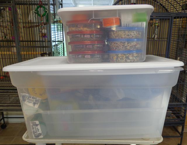 In the 20 Quart plastic tote we placed the seven sandwich size containers of bird and small mammal foods in stacks of three and four. The snack sized containers of food, the baby food, and the smaller cans were then inserted along the side (see next photo) with the two larger cans and a few smaller ones on top. This allowed the lid to latch.